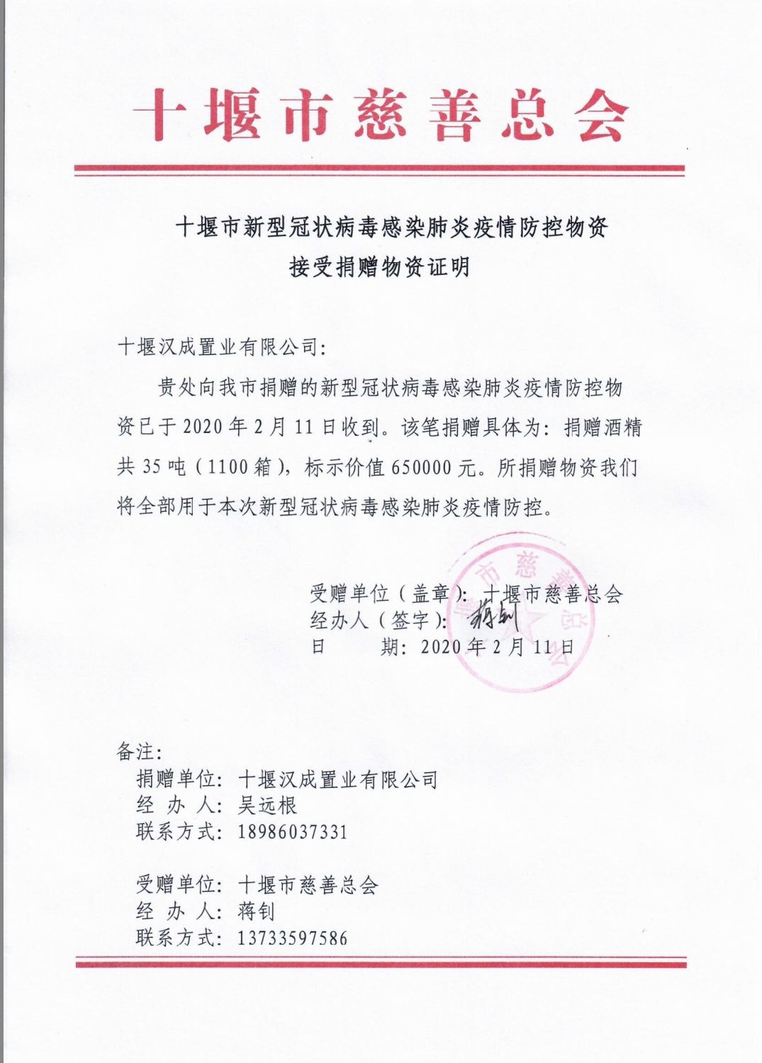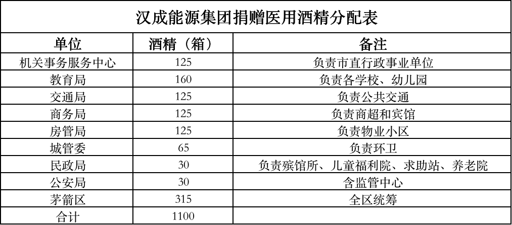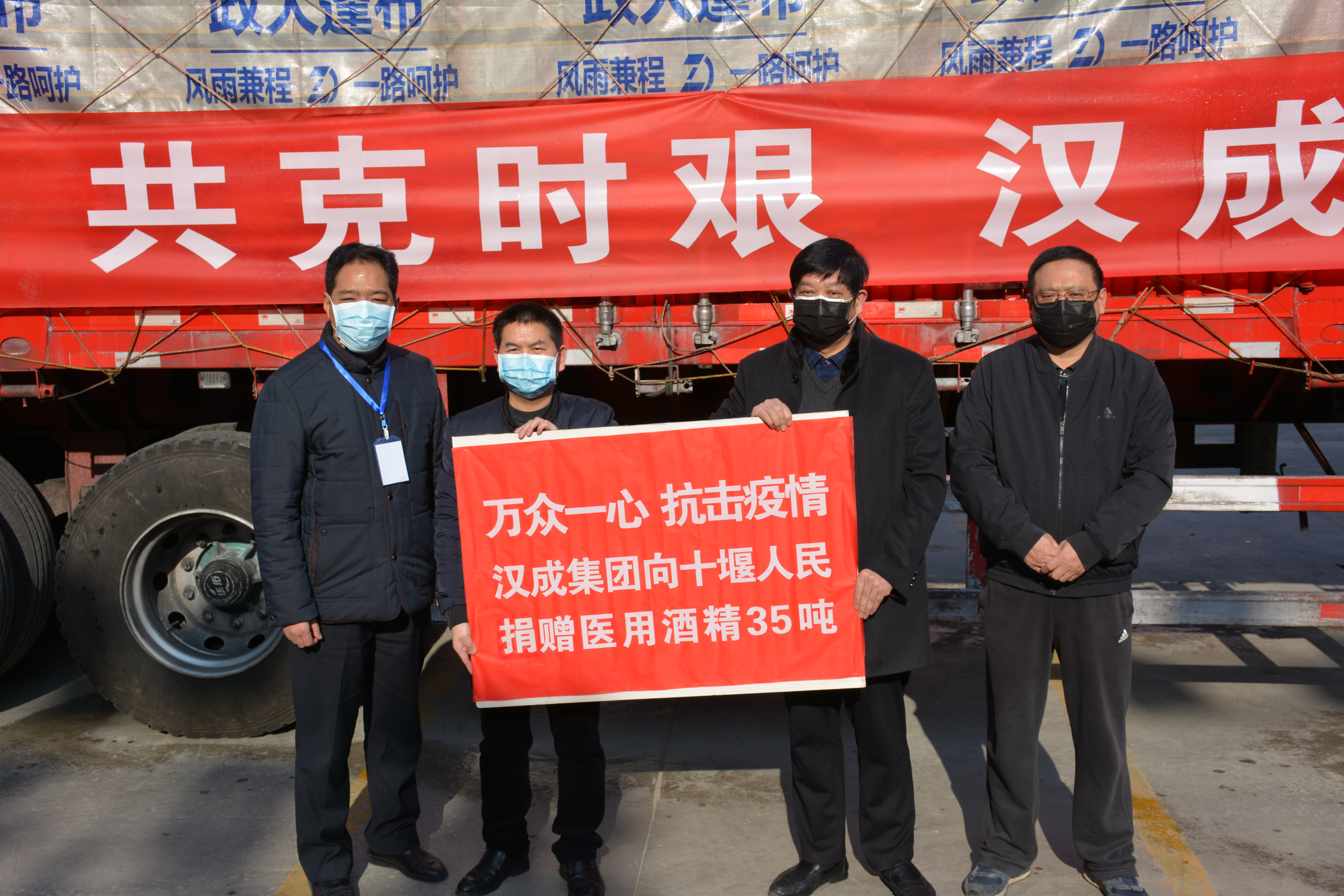 通過(guò)多方面努力,漢成能源集團(tuán)于新疆博州市緊急采購(gòu)了35噸醫(yī)用酒精,總價(jià)值65萬(wàn)元。2月7日中午開(kāi)始裝車(chē),8日凌晨出發(fā),總歷時(shí)96小時(shí),長(zhǎng)途奔襲3491公里,日夜兼程,橫跨半個(gè)中國(guó),終于11日中午抵達(dá)十堰。2020年2月11日下午3時(shí),漢成能源集團(tuán)房地產(chǎn)事業(yè)部總經(jīng)理助理吳遠(yuǎn)根帶領(lǐng)公益活動(dòng)執(zhí)行小組成員代表漢成能源集團(tuán)向十堰市慈善總會(huì)捐贈(zèng)送達(dá)醫(yī)用酒精35噸,助力十堰人民抗擊疫情。